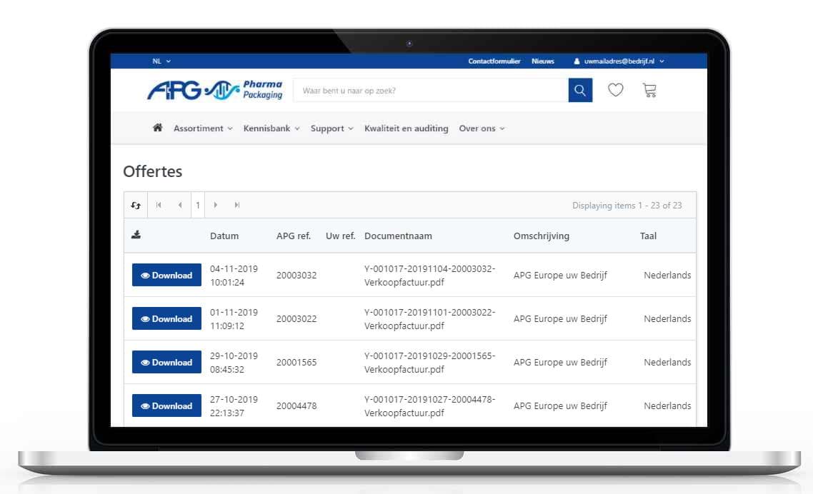 Bij het aanvragen van prijzen voor specifieke artikelen, aantallen en plaats van levering ontvangt u van APG Europe een gedetailleerde offerte. Alle offertes die aan u en uw organisatie zijn uitgebracht vindt u terug onder 'Offertes' binnen de module Transacties.
